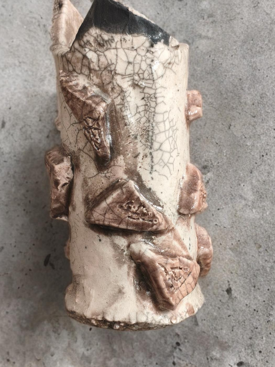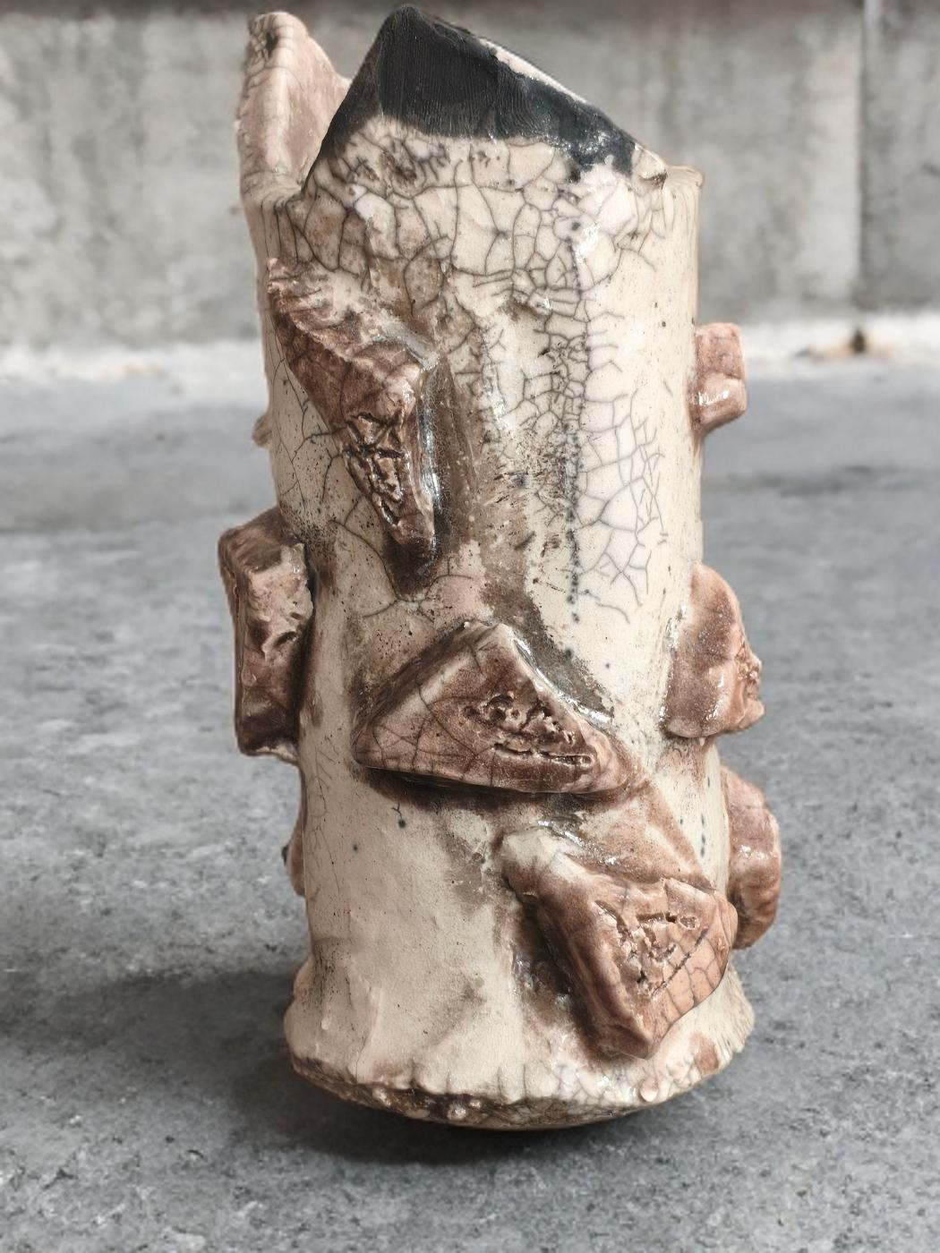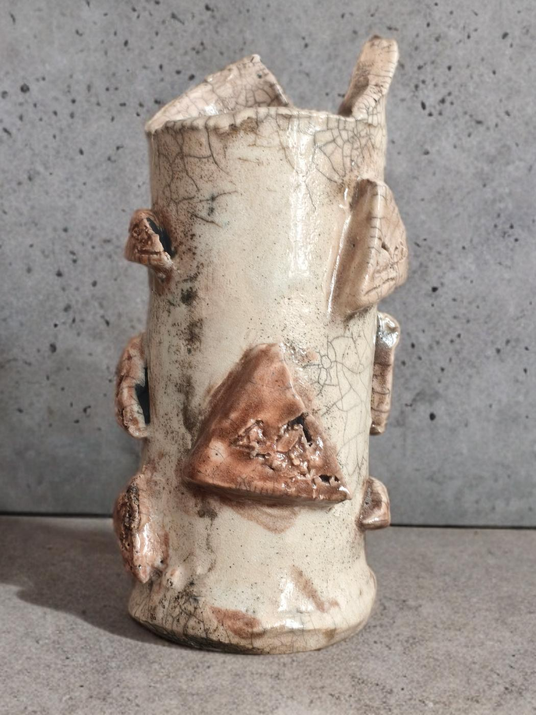 Neutral-toned cylindrical vase with cracked texture and geometric clay accents.