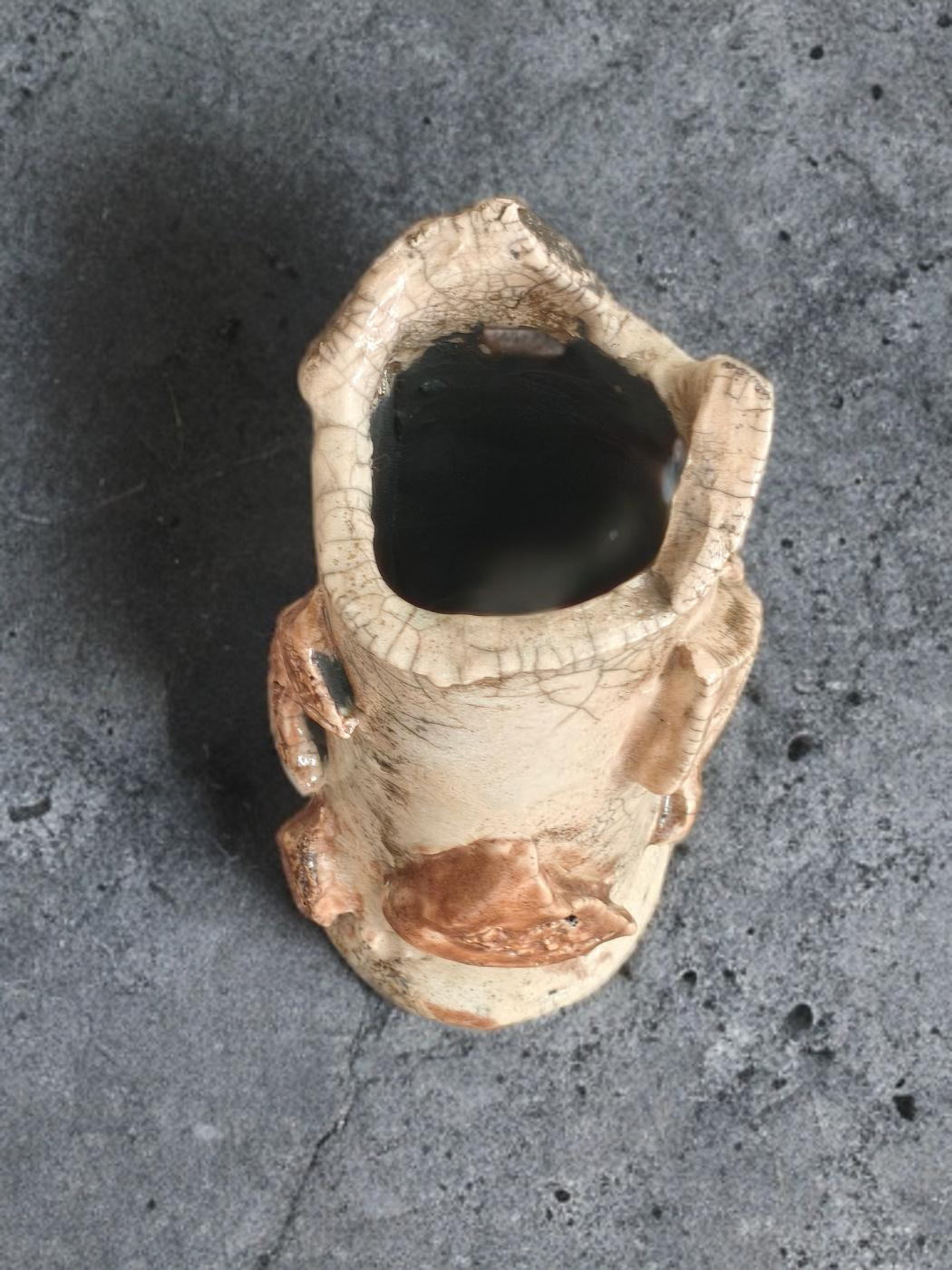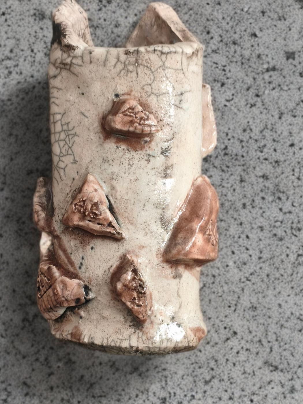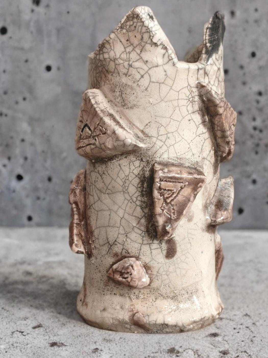 Neutral-toned cylindrical vase with cracked texture and geometric clay accents.