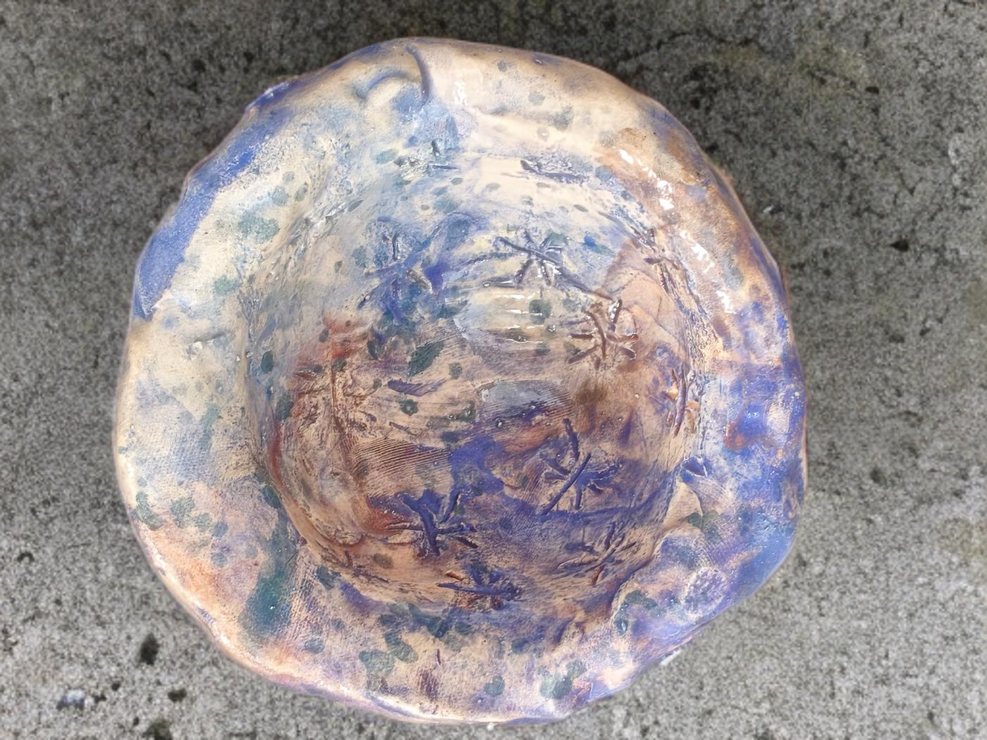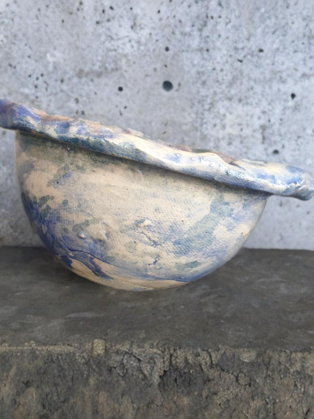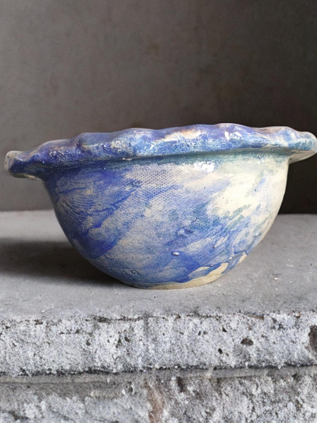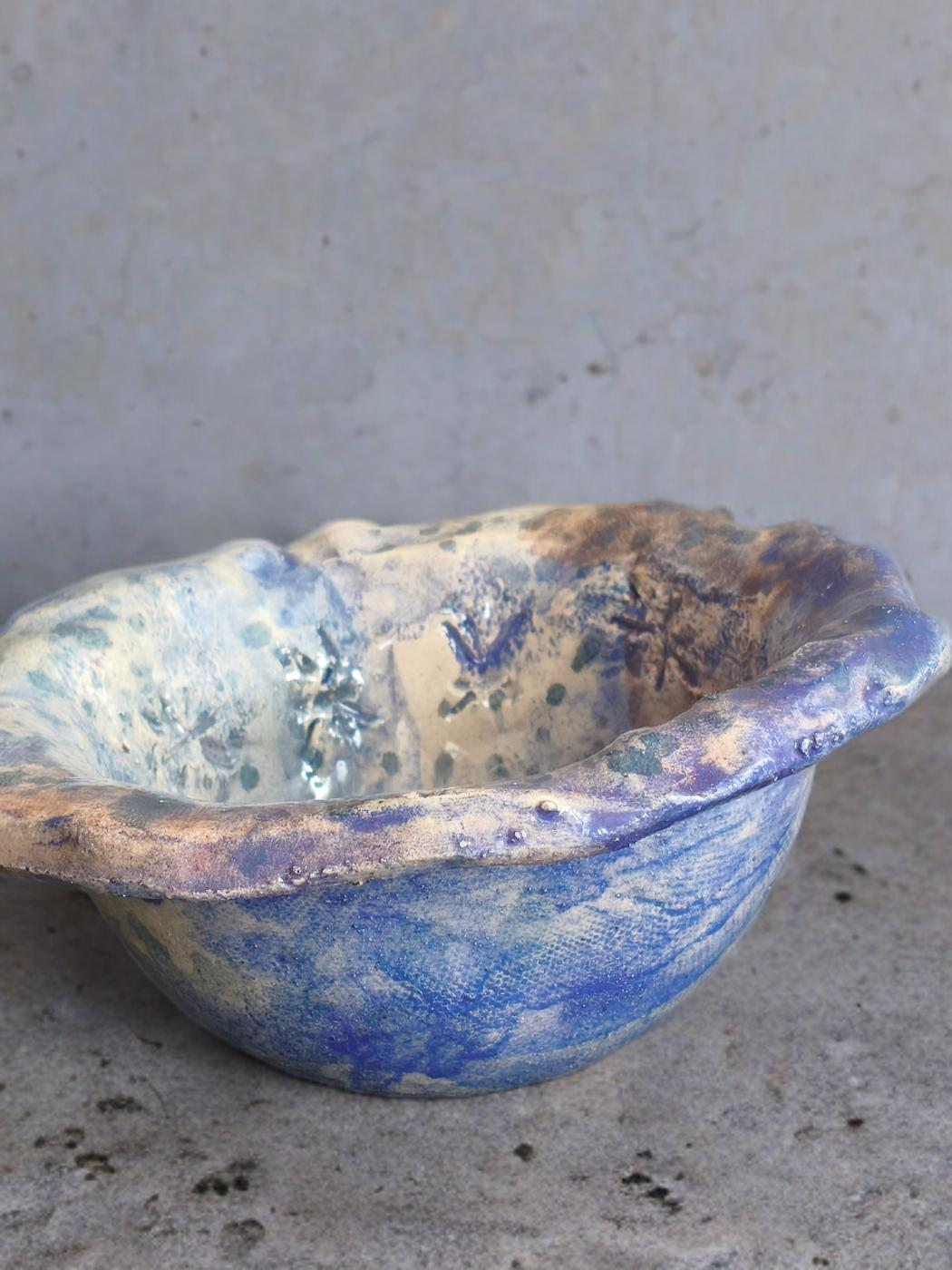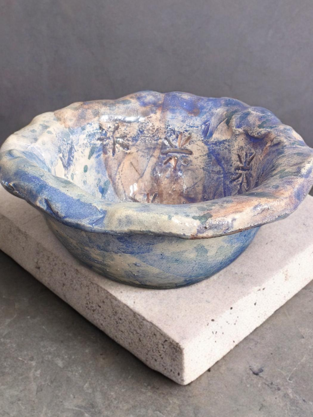 Deep bowl with indented floral patterns and a rustic blue finish.